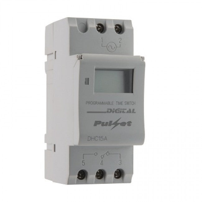 Digital 7 day Din Rail mount timer with 15A resistive load relay and 8 programmable on/off settings (resistive load)