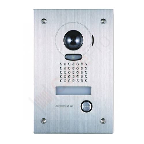 The JP-DVF faceplate is stainless steel, the call button is metal and the camera is protected with a clear polycarbonate lens cover. The JP-DVF features a color CMOS camera, speaker and mic for communication, illuminated call directory and white illumination LED for low light conditions.