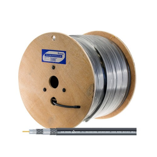 Premium quality pay tv approved RG6 Quad shielded coax cable with 0.86mm thick outer PVC jacket. 1.02mm copper clad steel centre conductor. 4.57mm foamed HD polyethylene dielectric. 60 micron thick bonded laminated aluminium foil shielding tape. 4.78mm core diameter. Aluminium alloy wire braided. Overall diameter 7.54mm.