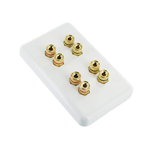 This wall plate allows the connection of 4 speakers. The perfect solution to keep things looking good when running cables through the walls, floor or ceiling in your home theatre system.